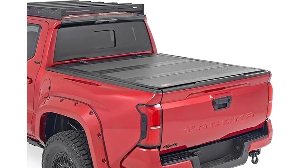 Looking for a tonneau cover that blends style with functionality for your 2024-2026 Toyota Tacoma? The Rough Country Hard Tri-Fold Truck Bed Tonneau Cover is a top contender. Its sleek, low-profile aluminum design with a matte black finish enhances your truck’s look while offering durability. You’ll appreciate the easy access with quick-connect prop rods and an auto-latching system for one-hand operation.